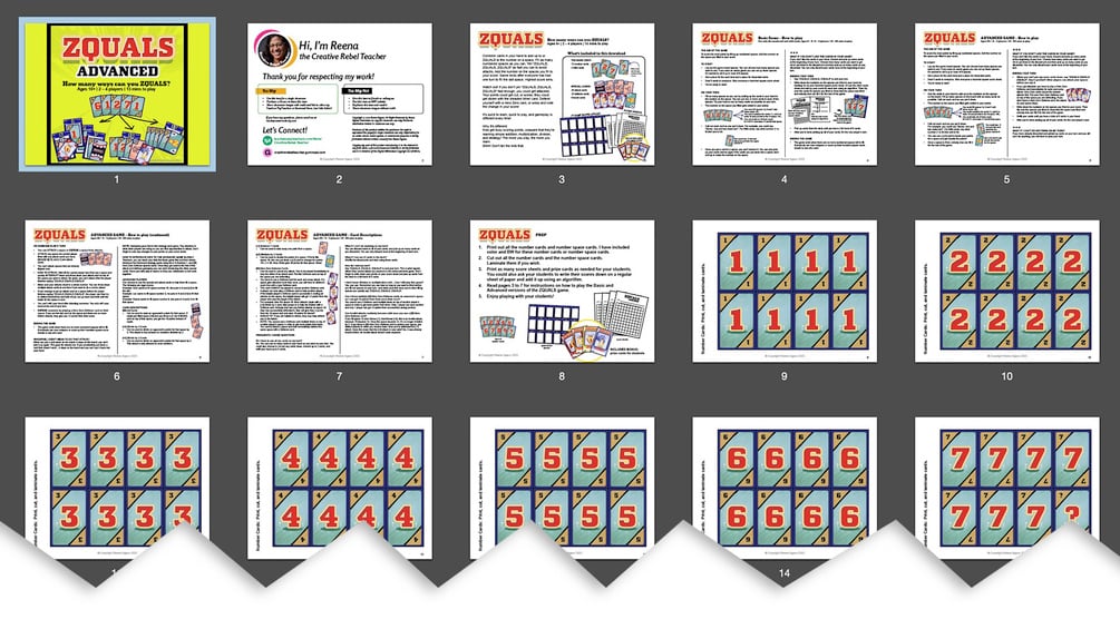 I created this math game to supplement my child's learning at home. Initially, I created it just to help my daughter master mental math addition facts. Early in 2022 while I was quarantining at home with her I realized I could modify my simple math game and make it more fun while exploring the concepts of subtraction, division, multiplication, and strategy. I've tested my game ZQUALS (pronounced zee-kwals) with kids and adults and it's a hit. I'm proud to share it with you here on TpT. I hope it brings some joy to your classroom.